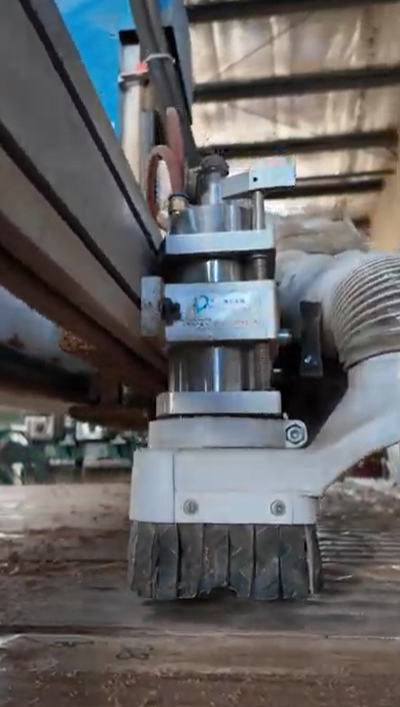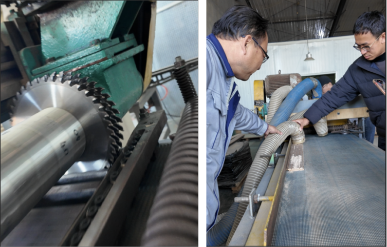 @リブパネルまずは最近流行りのリブパネルです。 無垢材を1本1本製作し、施工することもありますが、やはりコストが高くなり、採用が難しいと感じる方が多いのではないでしょうか。 弊社では合板に突板貼りした材に、中央に3本溝加工することにより、お値打ち価格でリブパネルのご提案が可能です。 それでは実際の製造工程を見ていきましょう。 まずは、中央に溝加工を行っていきます。 この刃物で溝加工を行っていきます。粉が大量に出るので粉を吸いながらラインに流します。
