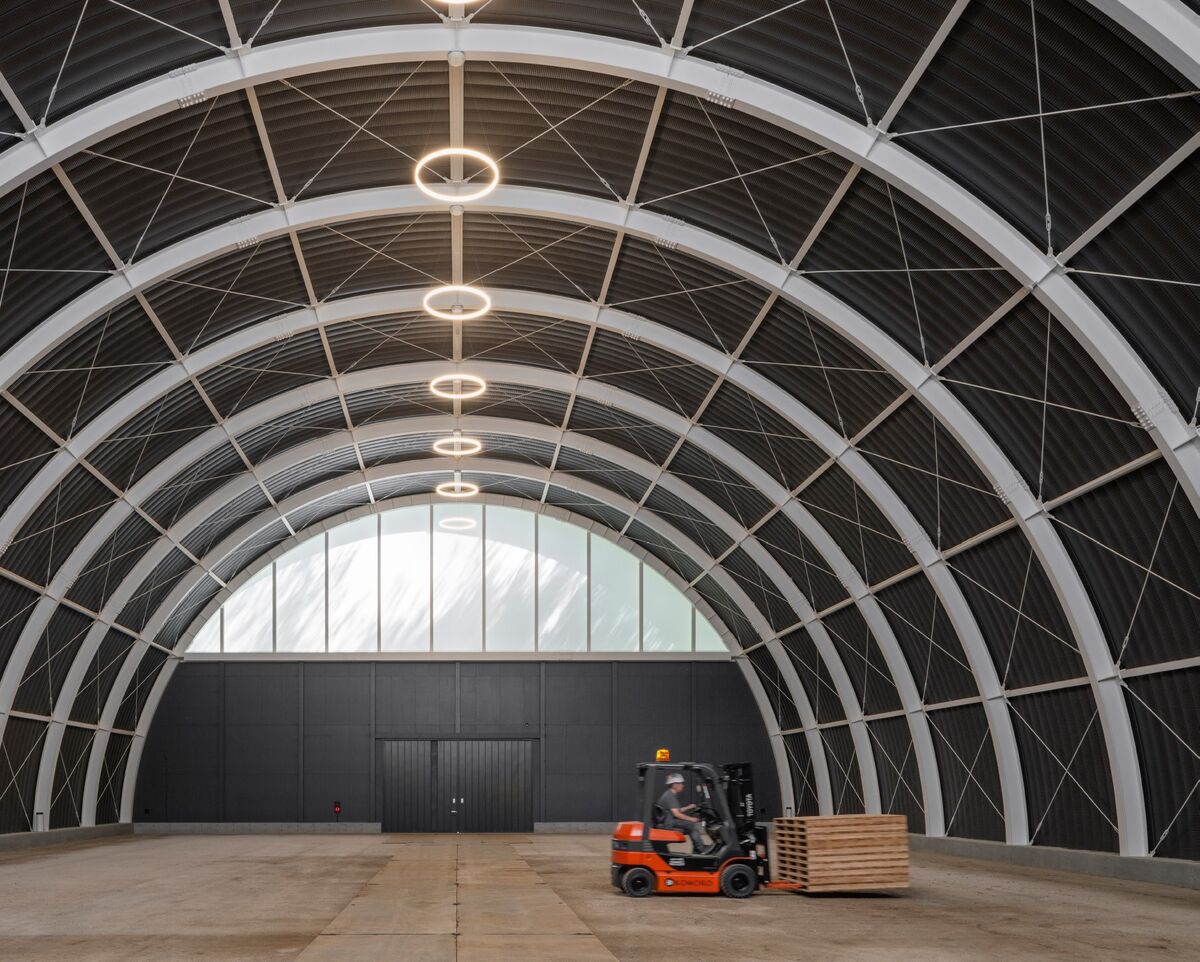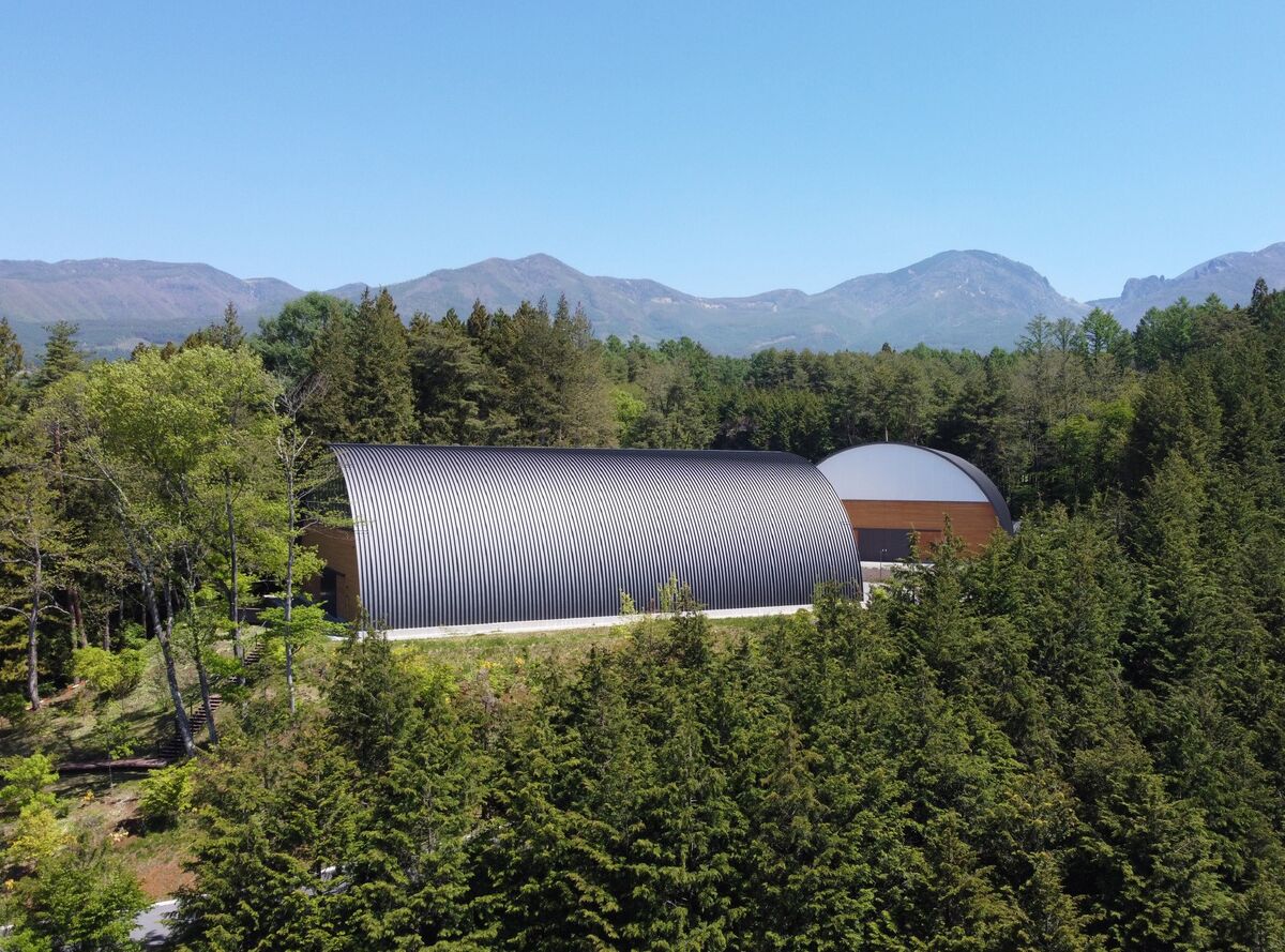 ただし建築には通常、床の下には基礎がある。計画した熟成庫は幅26m長さ40mの大空間。樽のレイアウトの自由度を確保すべく内部に柱は無い。一般的な工法では巨大な基礎が必要である。折角の土の床がコンクリートで地球と断絶されてしまっては意味がない。我々は如何に基礎を小さくするかに腐心することとなった。古今東西の事例を調べ抜き、導き出した工法は、19世紀の野戦病院にルーツを持つアーチの構造体である。厚さ0.8mmの金属板と梁成400mmの鋼材により構成されたスパン26mの空間は、高さ13mながら地上部の躯体重量は60kg/m2と極めて軽い。これにより基礎は最小化され、内部の床は周囲の森の土壌と接続されたままとなった。