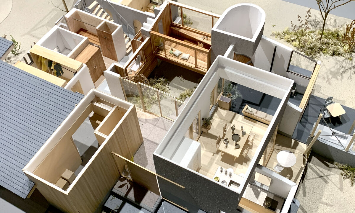 近年、デジタル技術の進化によって、建築の打ち合わせ風景は大きく変わりつつある。図面やパースに加え、VRやAIといった技術が当たり前のように使われるようになり、建築のイメージはこれまで以上に自由に、立体的に共有できるようになった。空間は画面の中で容易に体験され、まだ存在しない建築が、あたかもそこにあるかのように感じられる時代である。 それでもなお、建築模型という存在は揺らいでいない。むしろ、その価値は別のかたちで際立ってきているように感じる。私たちの事務所において模型とは、単なる説明のための道具ではなく、「小さな建築」として設計されるものだ。実際に建つ建築とは異なる存在でありながら、そこには確かにひとつの空間が立ち上がり、手の届く距離の中で静かに佇んでいる。 縮尺1/30で制作した「大地の住処」という住宅の建築模型