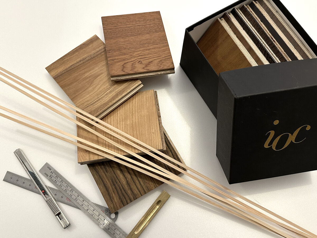 もちろん、模型に使われる素材は実物とは異なる。例えばフローリングはヒノキ材で表現し、水彩ペンで着彩する。実際の材料とはかけ離れているが、それは単なる代替にはならない。カットサンプルのような実物の断片と並べられたとき、両者は対立するのではなく、むしろ行き来できる関係として立ち現れる。模型の中の素材は、現実を指し示しながらも、そこから少しだけ離れることで、これから始まる暮らしの風景へと静かにひらかれていく。