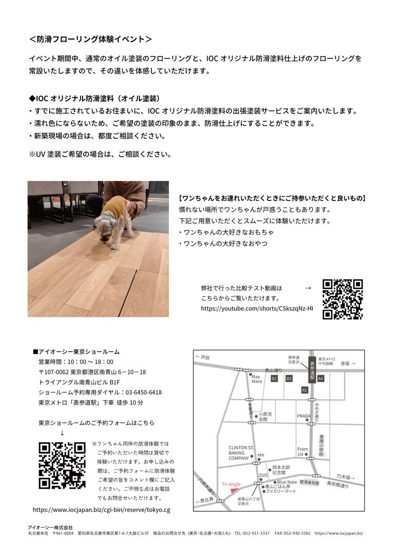 アイオーシーでは、「ペットが滑ってしまって、何か対策をしたい・・・」や、 「こどもや高齢者がいるので、転ばないか心配」というお声から、防滑塗料を開発いたしました。 以下の期間、体験イベントを開催いたしますので、ぜひこの機会にワンちゃんやお子様とご一緒に、ご来場ください。 イベント期間:2024年3月1日(金)〜3月31日(日) ワンちゃん同伴の防滑体験では、ご予約いただいた時間は貸切で体験していただけます。 お申し込みの際は、東京ショールームご予約フォームに、「防滑体験ご希望」の旨をご記入ください。 東京ショールームのご予約はこちら https://www.iocjapan.biz/cgi-bin/reserve/tokyo.cgi 皆様のご予約、お待ちしております。 会場:IOC東京ショールーム 東京都港区南青山6-10-18トライアングル南青山ビルB1F TEL:03-6450-6418 |