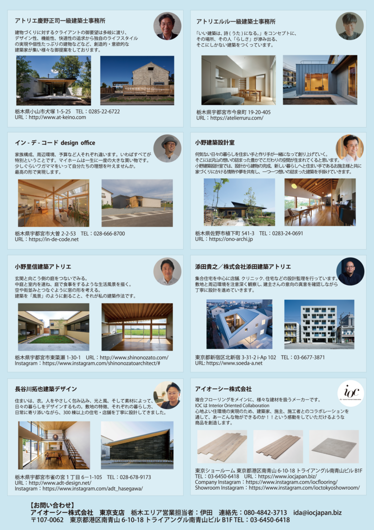 【設計事務所】 ・アトリエ慶野正司一級建築士事務所 ・アトリエルル一級建築士事務所 ・イン-デ-コード design office ・小野建築設計室 ・小野里信建築アトリエ ・添田貴之/添田貴之建築アトリエ ・長谷川拓也建築デザイン 【キッチンメーカー】 ・mobilitipo(モービリティーポ) 【建材メーカー】 ・アイオーシー株式会社 社員一同お待ちしております! 【お問合せ】 栃木エリア営業担当者 伊田 TEL:080-4842-3713 MAIL:ida@iocjapan.biz |