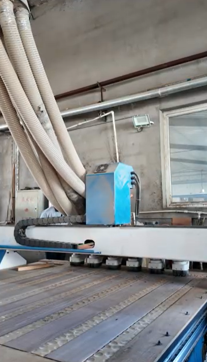 @リブパネルまずは最近流行りのリブパネルです。 無垢材を1本1本製作し、施工することもありますが、やはりコストが高くなり、採用が難しいと感じる方が多いのではないでしょうか。 弊社では合板に突板貼りした材に、中央に3本溝加工することにより、お値打ち価格でリブパネルのご提案が可能です。 それでは実際の製造工程を見ていきましょう。 まずは、中央に溝加工を行っていきます。 この刃物で溝加工を行っていきます。粉が大量に出るので粉を吸いながらラインに流します。