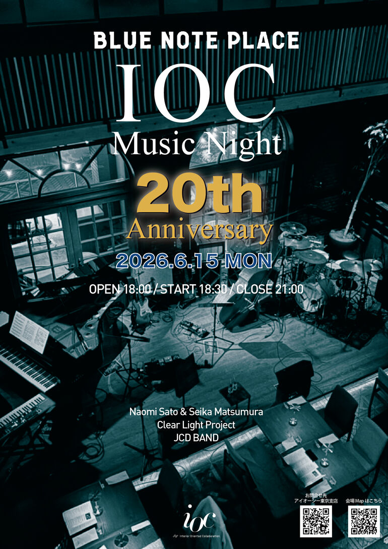 このたび、アイオーシー株式会社は、皆様のお力添えにより創立20周年を迎えることができました。 日頃のご支援に心より感謝申し上げます。 皆様への感謝の気持ちをお届けしたく、20周年記念の音楽イベントを開催いたします。 イベントは3組のバンド演奏に加え、トークショーもお楽しみいただける内容となっております。 また、節目となる今回は、JCD BANDとして当日も演奏してくださる小坂竜氏ご設計のブルーノートプレイスにて開催いたします。 当日は軽食やドリンクもご用意しておりますので、ライブ演奏とともにどうぞごゆっくりお楽しみください。 日程:2026年6月15日(月) 時間:開場18:00 / 開演18:30 / 閉場21:00 会場:ブルーノートプレイス 東京都渋谷区恵比寿4-20-4 恵比寿ガーデンブレイス 参加費:無料 ※スタンディングでのライブとなりますため、大きな手荷物のお持ち込みは、できるだけご遠慮ください。 ※ご予約が必要ですので、詳しくは、こちらへ |