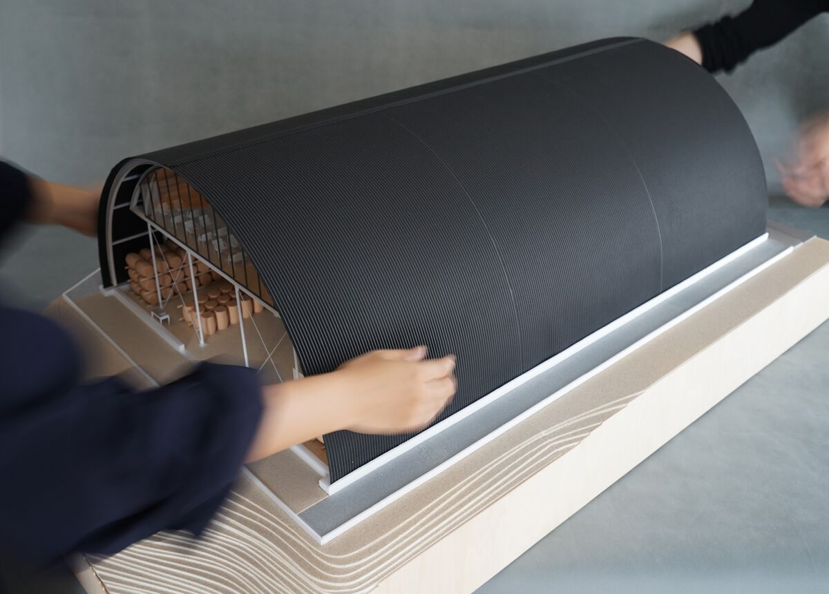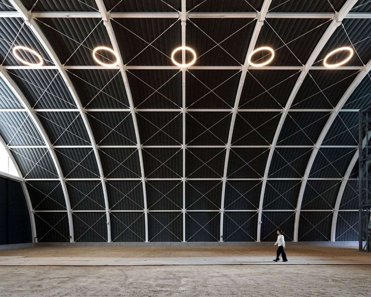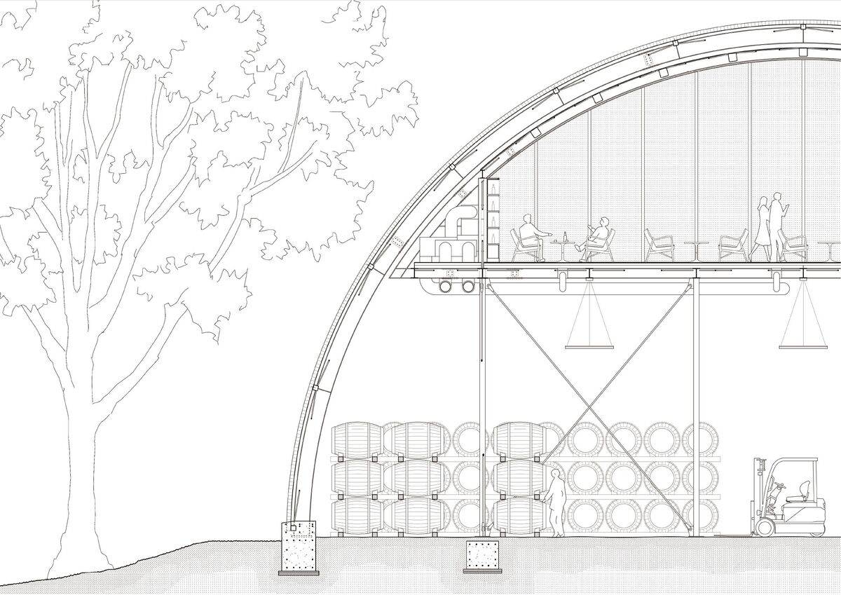 ただし建築には通常、床の下には基礎がある。計画した熟成庫は幅26m長さ40mの大空間。樽のレイアウトの自由度を確保すべく内部に柱は無い。一般的な工法では巨大な基礎が必要である。折角の土の床がコンクリートで地球と断絶されてしまっては意味がない。我々は如何に基礎を小さくするかに腐心することとなった。古今東西の事例を調べ抜き、導き出した工法は、19世紀の野戦病院にルーツを持つアーチの構造体である。厚さ0.8mmの金属板と梁成400mmの鋼材により構成されたスパン26mの空間は、高さ13mながら地上部の躯体重量は60kg/m2と極めて軽い。これにより基礎は最小化され、内部の床は周囲の森の土壌と接続されたままとなった。