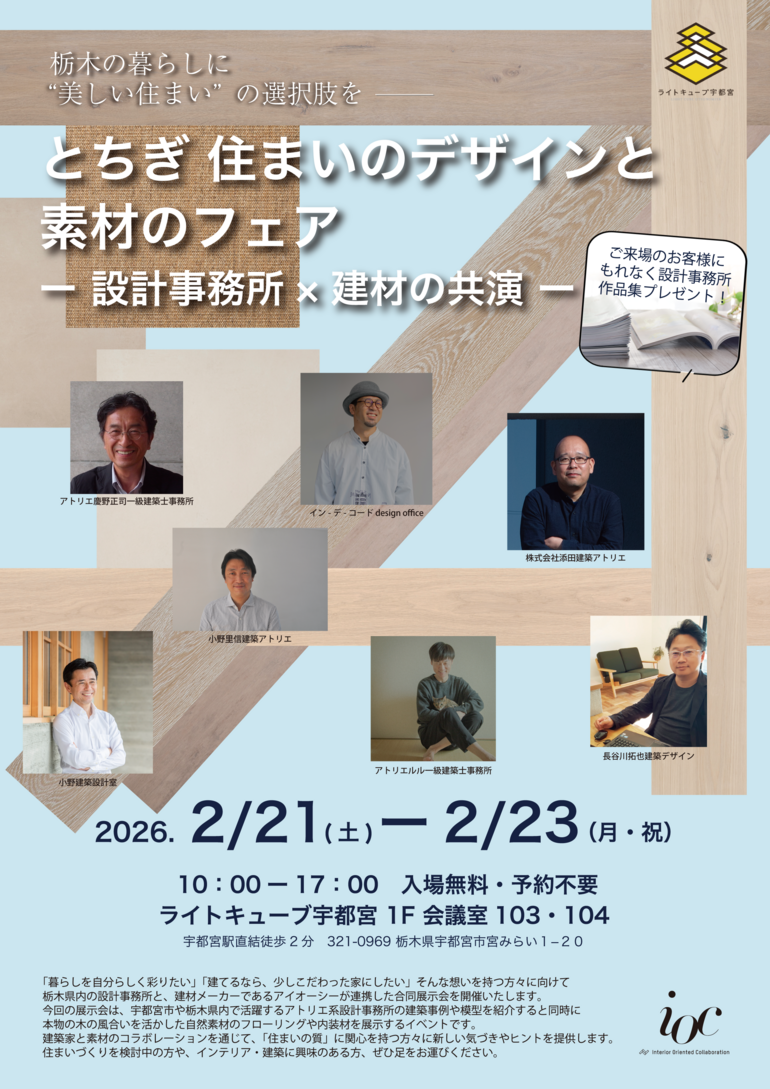 コラボした展示会を開催します。 『家は永く使うものー』 「暮らしを自分らしく彩りたい」「建てるなら、少しこだわった家にしたい」 そんな想いを持つ方々に向けて、栃木県内の設計事務所と、キッチンメーカーであるmobilitipo、建材メーカーであるアイオーシーが 連携した合同展示会を開催いたします。 今回の展示会は、宇都宮市や栃木県内で活躍するアトリエ系設計事務所の建築事例や模型を 紹介すると同時に、本物の木の風合いを活かした自然素材のフローリングや内装材を展示するイベントです。 建築家と素材のコラボレーションを通じて、「住まいの質」に関心を持つ方々に新しい気づきやヒントを提供します。 住まいづくりを検討中の方や、インテリア・建築に興味のある方、ぜひ足をお運びください。 ご来場いただきアンケートをご回答の皆様には、設計事務所の作品集をプレゼント致します! 【展示会概要】 日時:2026年2月21日(土)〜2月23日(月・祝)10:00〜17:00 会場:ライトキューブ宇都宮 1F会議室 103・104 〒321-0969 栃木県宇都宮市宮みらい1-20 ※宇都宮駅デッキ直結徒歩2分 ※入場無料・予約不要 ■出展者