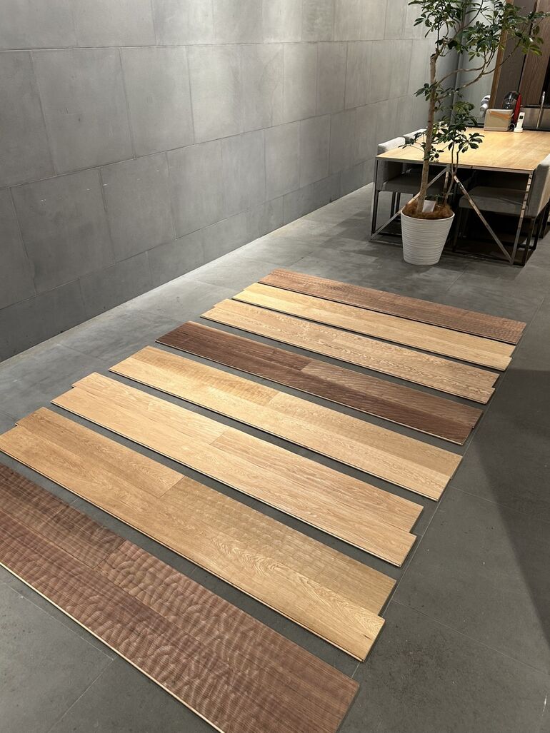 スプーンカットのフローリングは、これまでの2種類(フォイユ、ヘックスレジェ)に加え、 新たに6種類が仲間入りしました。 今回は全8種類のデザインを一度にご覧いただけます。 表情豊かなラインアップからお好みのものを見つけてください。 また、スプーンカットならではの心地よい足触りも実際にお試しいただけます。 <スプーンカット(名栗加工)の商品情報> 【展示商品】 ▪アッシュ30クリアオイルウィンド ▪アッシュ30クリアオイルシェル ▪オーク30クリアオイルヘックスレジェ ▪オーク30クリアオイルウェーブ ▪オーク30クリアオイルニュートラル ▪ウォールナット30クリアオイルフォイユ ▪ウォールナット30クリアオイルオンド ▪ウォールナット30クリアオイルモレ こちらの展示は予約不要でご自由にご覧いただけますので、お気軽にお立ち寄りください。 【展示日程】 5月1日(金)〜5月30日(土) 営業時間10:00〜18:00 ※5月4日〜5月6日は休業 ※5月13日(水)はショールーム内での撮影のため、ご案内は13時までとなります ※他の商品もご覧になりたい方、スタッフに相談しながらご検討されたい方は 事前にご予約の上、ご来場くださいませ。 <東京ショールームのご予約はこちらから> 【アイオーシー東京ショールーム】 東京都港区南青山6-10-18 トライアングル南青山ビルB1F TEL:03-6450-6418 <東京ショールームの詳細> 東京ショールーム スプーンカット展