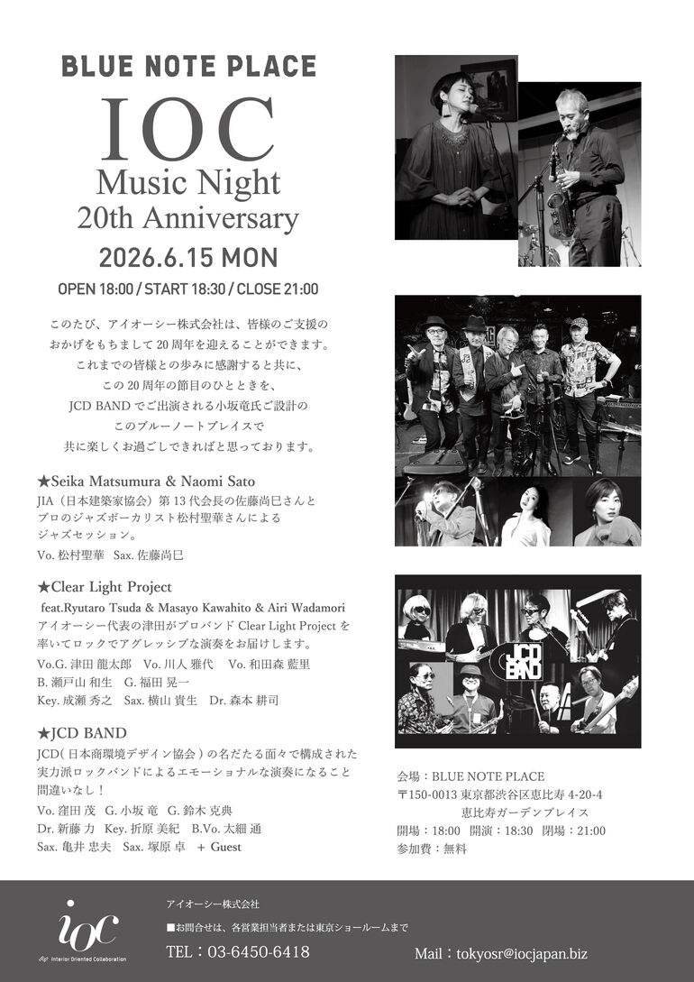 新緑が心地よい季節となりましたが、皆さまいかがお過ごしでしょうか。このたび、アイオーシー株式会社は、皆様のお力添えにより創立20周年を迎えることができました。 日頃のご支援に心より感謝申し上げます。 皆様への感謝の気持ちをお届けしたく、20周年記念の音楽イベントを開催いたします。 イベントは3組のバンド演奏に加え、トークショーもお楽しみいただける内容となっております。 また、節目となる今回は、JCD BANDとして当日も演奏してくださる小坂竜氏ご設計のブルーノートプレイスにて開催いたします。 当日は軽食やドリンクもご用意しておりますので、ライブ演奏とともにどうぞごゆっくりお楽しみください。